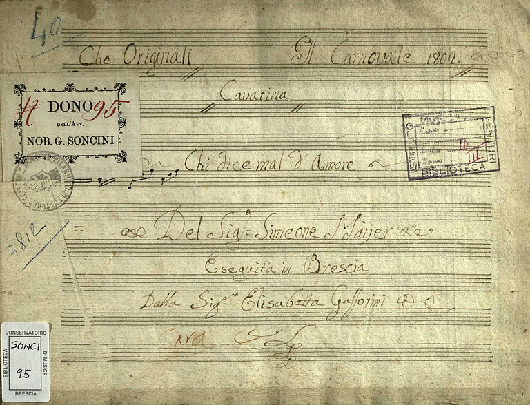 Johann Simon Mayr, maestro di Gaetano Donizetti, fu uno dei maggiori operisti tra l’ultimo decennio del Settecento e il primo dell’Ottocento. Tedesco di origini, nacque il 14 giugno 1763 a Mendorf (presso Ingolstadt) in Baviera e la sua prima educazione musicale derivò dal padre organista. Ebbe una formazione insolita per un musicista, in quanto rivolta anche a discipline letterarie e filosofiche: diventò così un dotto intellettuale come poi emerse dai suoi scritti e dalle sue abilità didattiche. Particolare non trascurabile fu la sua affiliazione all’Ordine degli illuminati, una società segreta analoga alla massoneria di ispirazione neoclassica, tramite la quale Mayr giunse poi in Italia proprio tra Bergamo e Venezia, probabilmente per consolidare la rete culturale delle pubblicazioni della società. La polizia di Venezia segnalò Mayr e i suoi compagni come persone sospette perché affiliate a una loggia proibita. Nel 1789 fu a Bergamo per studiare con Carlo Lenzi, compositore di scuola napoletana e maestro di cappella a S. Maria Maggiore. I primi lavori teatrali di Mayr risentirono dello stile napoletano che aveva in Cimarosa e Paisiello i maggiori esponenti. La sua carriera iniziò però a Venezia dove dal 1791 collaborò strettamente con l’ospedale dei Mendicanti e ivi, come era d’uso, compose oratori sacri in latino (tra cui Iacob a Labano fugiens) il cui successo gli assicurò contratti con La Fenice per la scrittura di opere e farse (Saffo, 1794; Un pazzo ne fa cento, 1796).