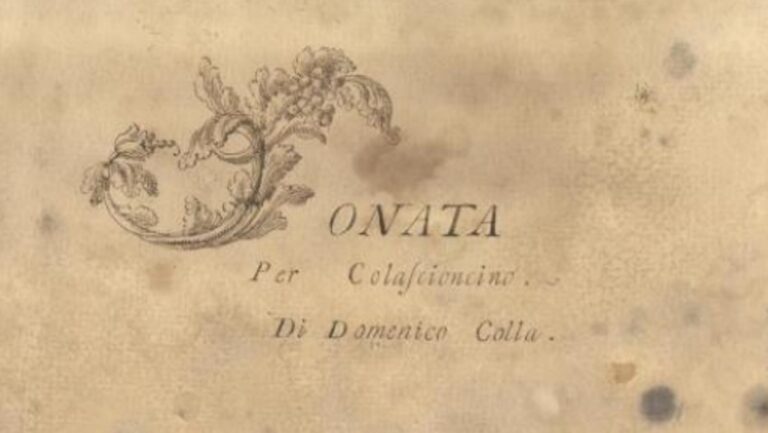 Nella sottostante Galleria fotografica, l’immagine n. 1 è del Fotostudio Rapuzzi. Accanto alla nota caricatura di Domenico Colla realizzata da Pier Leone Ghezzi (foto n. 2), includiamo il frontespizio di una Sonata manoscritta per colascioncino dello stesso Colla, conservata nella Biblioteca di Dresda e accessibile online.