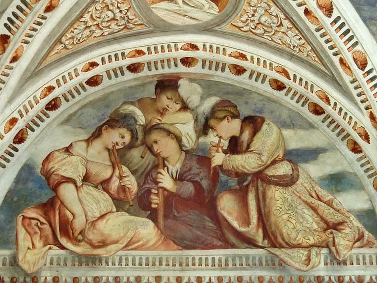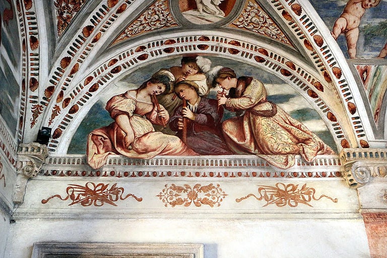 Nel 1528, per volontà del cardinale Bernardo Clesio, iniziarono i lavori di costruzione del Magno Palazzo a Trento, all’interno del Castello del Buonconsiglio. Tre anni più tardi, per la decorazione dell’edificio, il porporato invitò celebri pittori, tra cui Dosso Dossi, Marcello Fogolino e il Romanino. All’artista bresciano venne commissionata la decorazione della Loggia posta al piano nobile del palazzo e aperta in cinque arcate sul cortile dei Leoni. Il Concerto di flauti appare in alto, nella lunetta di sinistra della parete occidentale. Questa scena musicale è stata anche interpretata come un allegoria dell’amore.