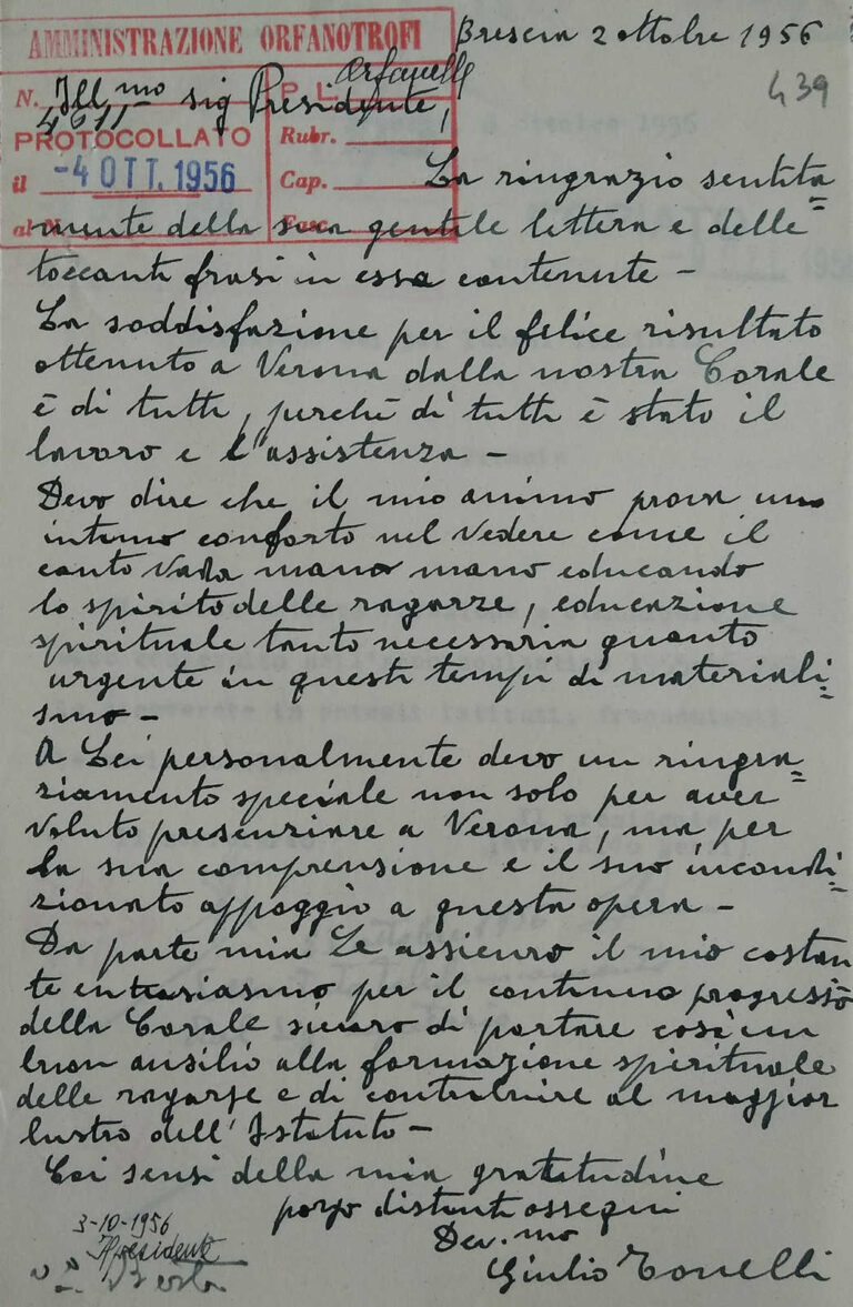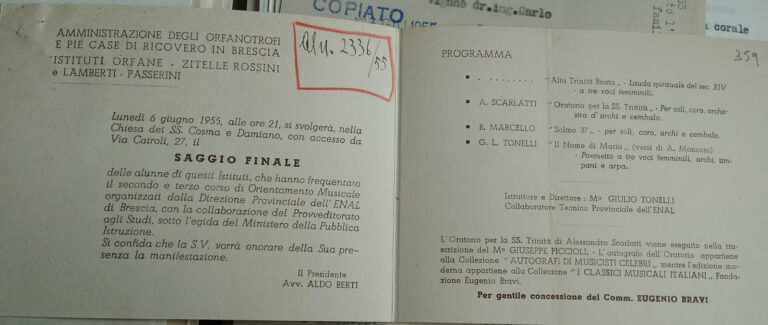 – si aprono le iscrizioni per il corso sul “Metodo Ward” i cui testi erano stati da poco tradotti in italiano. E, ancora, l’Istituto trova il finanziamento per corsi di canto che si concludono con il saggio, diretto da Giulio Tonelli, impegnandosi a «provvedere alla spesa dell’orchestra, indispensabile per l’esecuzione»: in programma, nel 1954, il Salmo IV di Benedetto Marcello e lo Stabat Mater di Pergolesi e, l’anno successivo, fra l’altro, l’Oratorio per la SS. Trinità, appena pubblicato nella collezione de “I Classici Musicali Italiani”. Tonelli poi guiderà il coro del Rossini in concorsi nazionali, a Modena, a Verona e a Milano, ottenendo ottimi risultati.