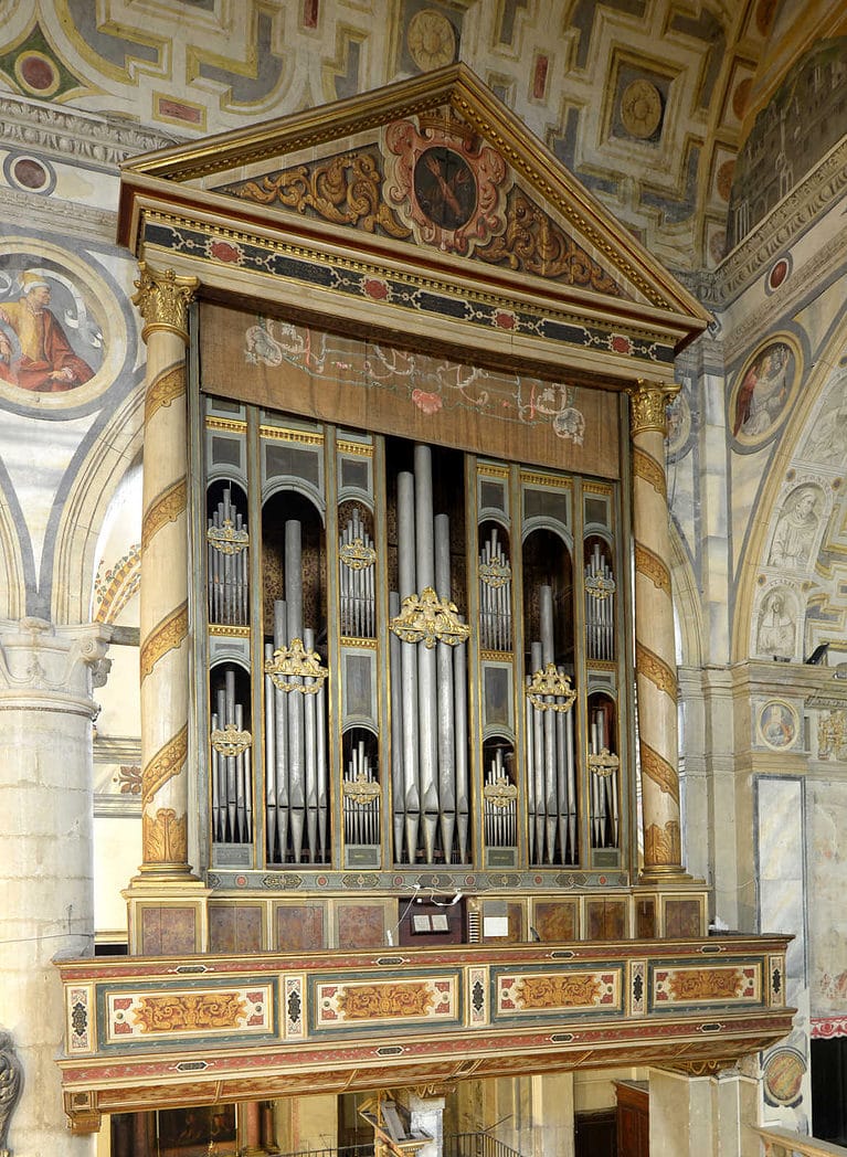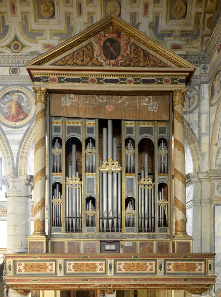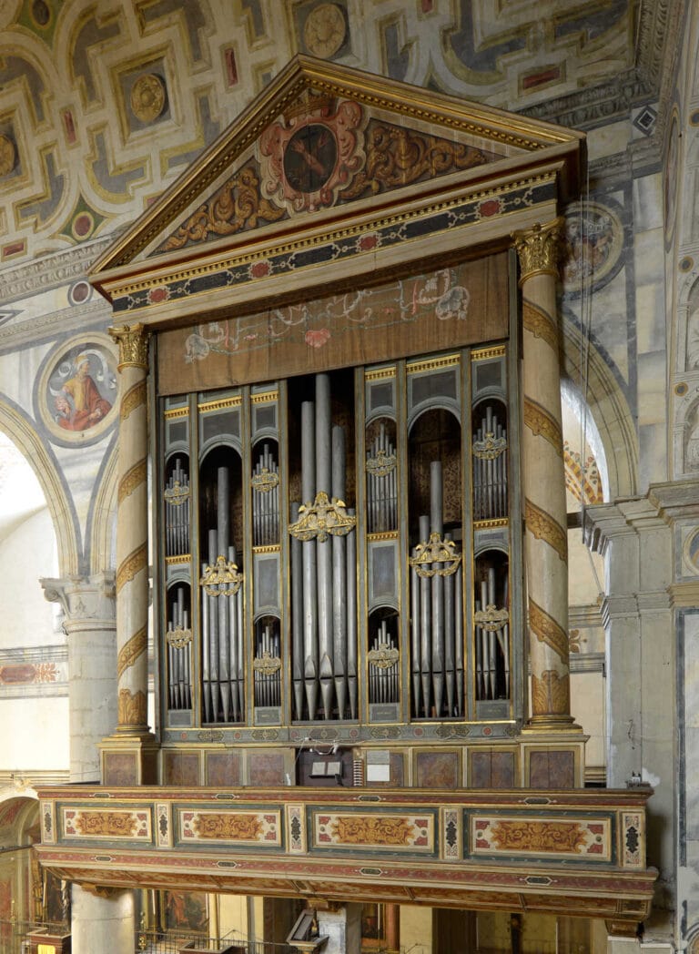 Nel 1804 Zaccaria Respini aggiunse i ‘Contrabassi’, ampliò l’estensione della tastiera sino al Do5 e trasformò il Flauto in Quintadecima in Cornetto. Nel 1857 Antonio De Lorenzi innalzò forse il corista mentre, nel 1902, Diego Porro inserì l’Oboe e la Viola da gamba in luogo del Flauto in Ottava e del Flauto Duodecima (quest’ultimo collocato al posto del Cornetto respiniano come Flautino 4), modificò il corista, aggiunse la Trigesima sesta e le note cromatiche a completamento dell’ottava corta. Sotto la direzione tecnico-scientifica di Luigi Ferdinando Tagliavini, nel 1955 lo strumento venne restaurato dall’organaro bresciano Armando Maccarinelli che ripristinò l’originaria fisionomia fonica dell’organo integrando i flauti precedentemente asportati. L’intervento, patrocinato dalla Soprintendenza ai Monumenti di Milano, inaugurò in Italia il restauro, inteso come critica e filologia in atto, dell’antico patrimonio organario nazionale.