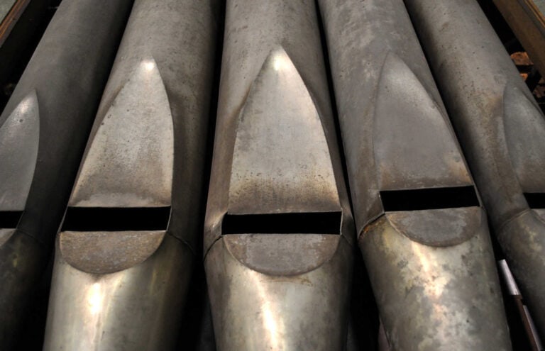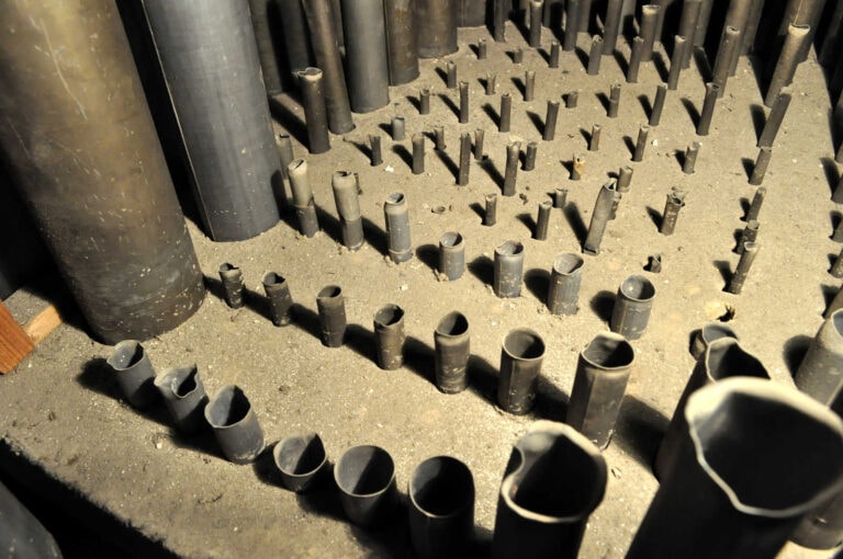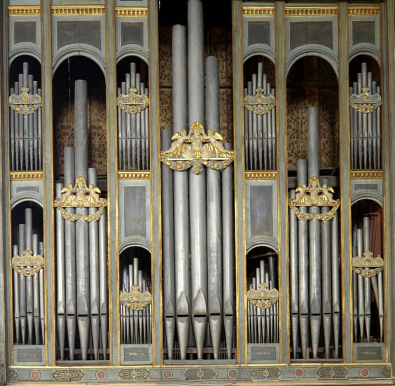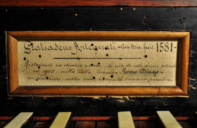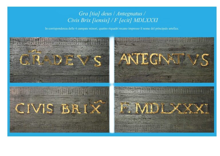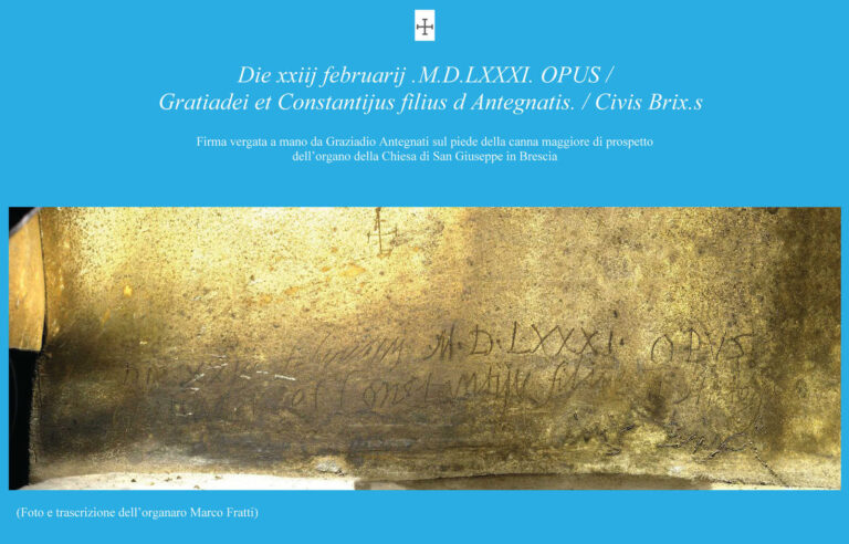 Le fotografie sottostanti sono di Giuseppe Spataro, tranne lo scatto numero 13, inedito (firma graffita a mano da Graziadio Antegnati all’interno della canna maggiore di facciata), che è dell’organaro Marco Fratti, ritratto nelle due immagini precedenti. Nella scritta si legge: “Die xxiij februarij .M.D.LXXXI. OPUS / Gratiadei et Constantijus filius d Antegnatis. / Civis Brix.s”. Le ultime due fotografie si riferiscono alla tomba di Costanzo Antegnati (“Tumulum Constantij Antegnati”). Crediti: Diocesi di Brescia, Ufficio per i beni Culturali Ecclesiastici, Aut. Prot. N. 110 / 2023.