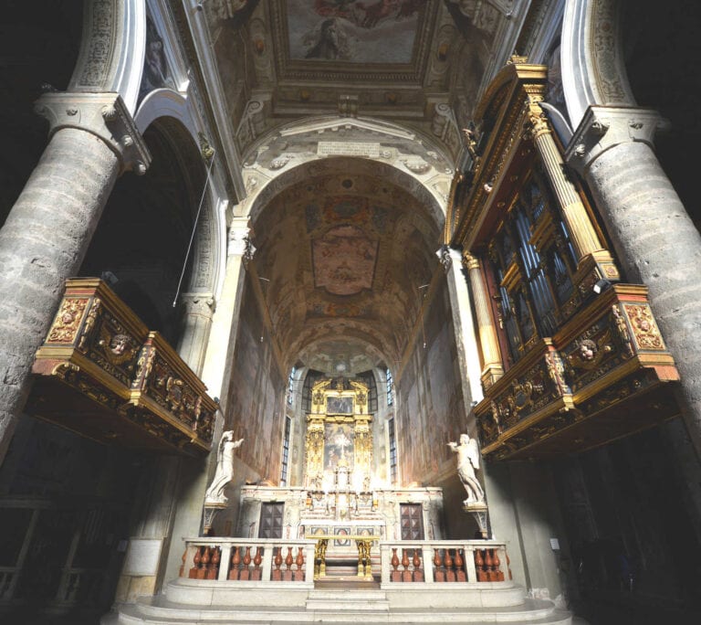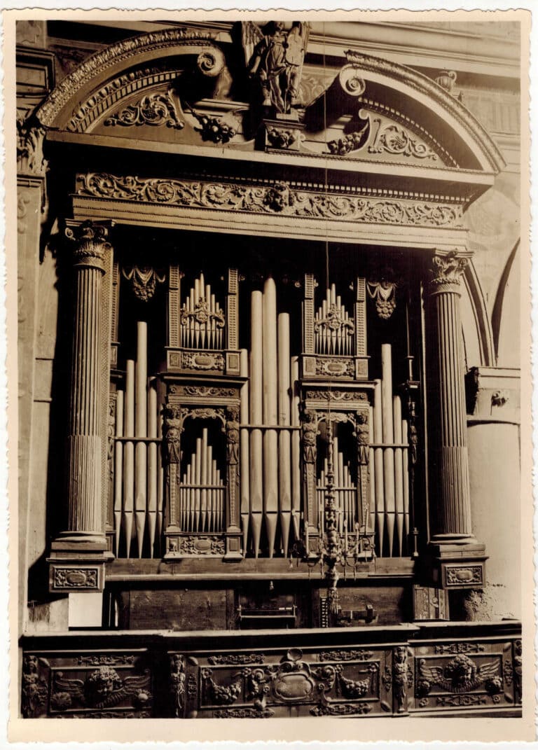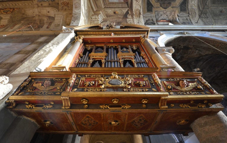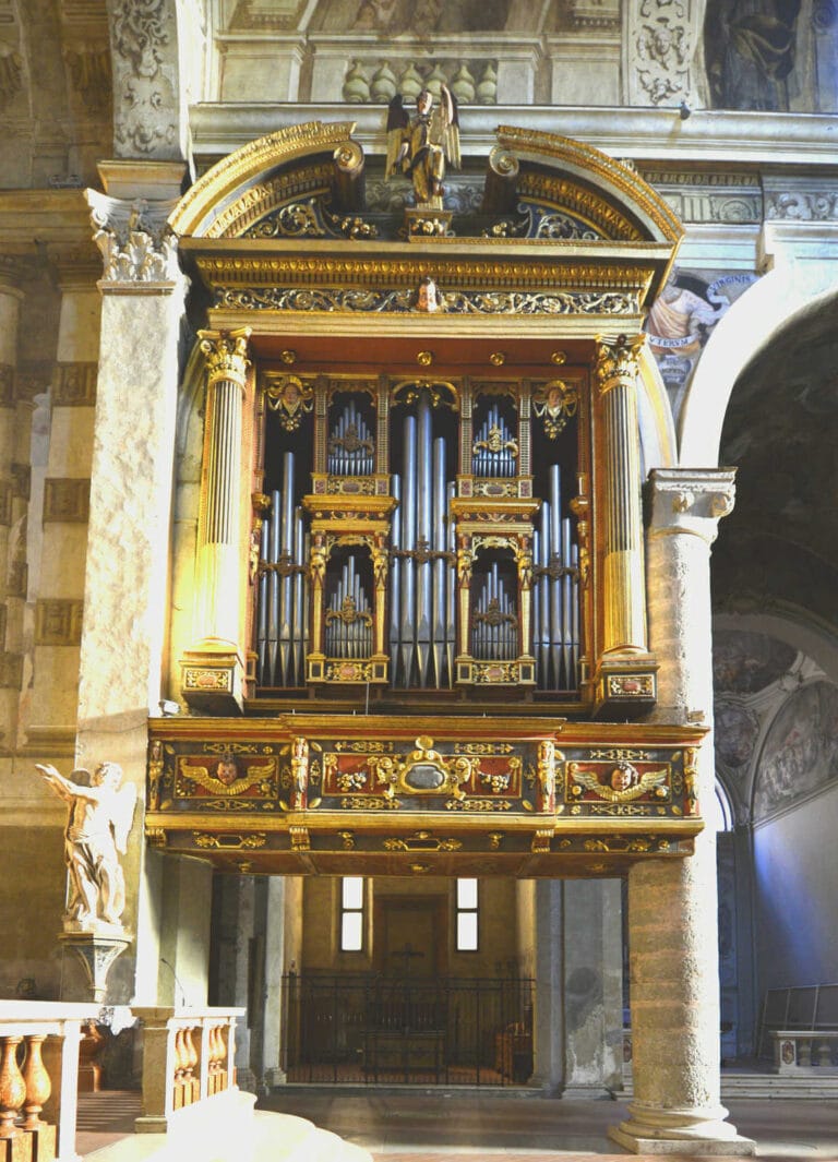 Il 1395 è la più antica data che attesta quivi la presenza di un organo, a questo, in più di due secoli, seguiranno almeno altri cinque strumenti due dei quali attribuiti agli Antegnati: il primo ad opera di Graziadio (1578) e il successivo di Costanzo (1610). Nel corso dell’Ottocento e nella prima metà del Novecento l’organo Meiarini subì alcune modifiche che portarono alla perdita del Flauto in XII e in VIII. Venne restaurato nel 1962 da Armando Maccarinelli sotto la direzione di Luigi Ferdinando Tagliavini e nel 1991 dalla casa organaria Mascioni.