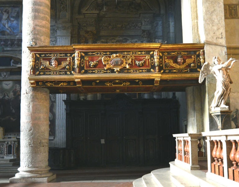 Collocato in cantoria lignea nel primo intercolunnio in cornu epistolae, l’organo si compone di una facciata