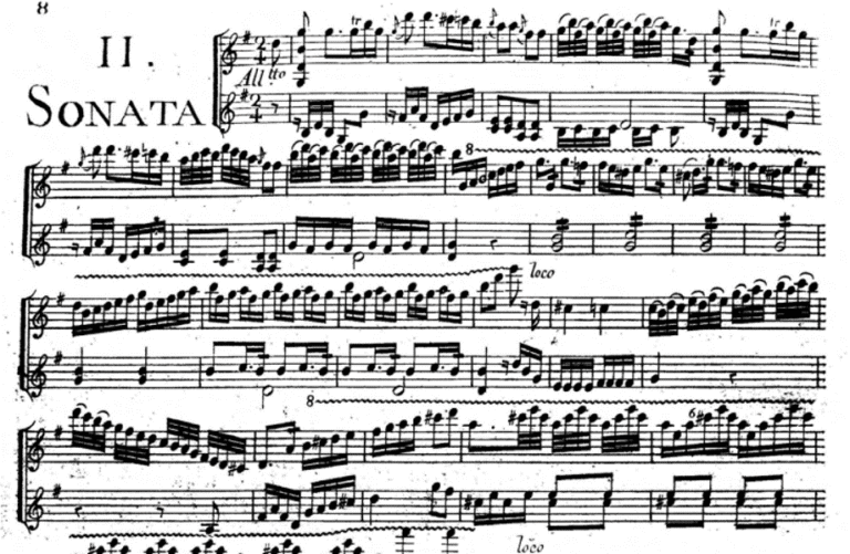La Sonata per due violini e basso in Sol maggiore è tratta dalla raccolta op. 9 di Antonio Lolli, stampata a Parigi intorno al 1770 con dedica al conte polacco Oginski. Articolata nei canonici tre movimenti (Allegretto, Adagio, Rondo) la Sonata rivela uno stile spiritoso, occasionalmente animato da episodi virtuosistici. Una riproduzione integrale della stampa è accessibile sul sito Imslp.