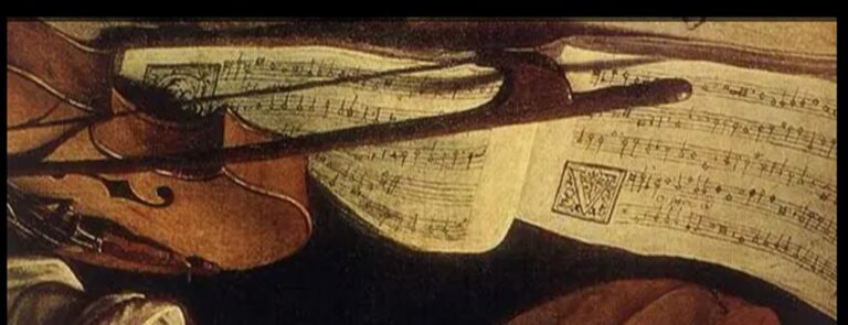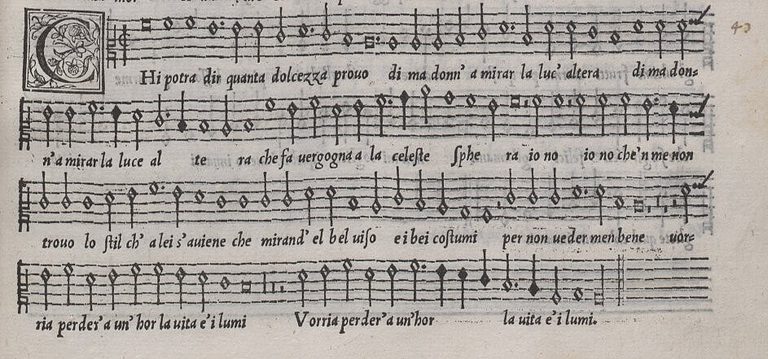 Nella terza immagine sottostante, con il dettaglio rovesciato della parte musicale, il foglio di sinistra presenta l’incipit del Basso del madrigale Chi potrà dir (si può confrontare con la trascrizione moderna qui allegata).