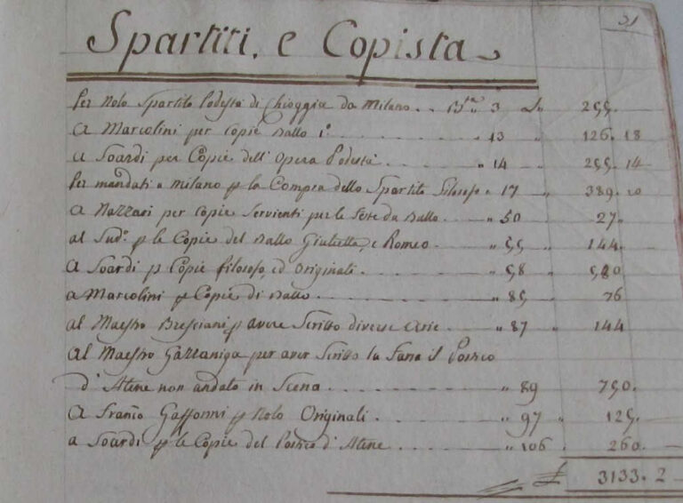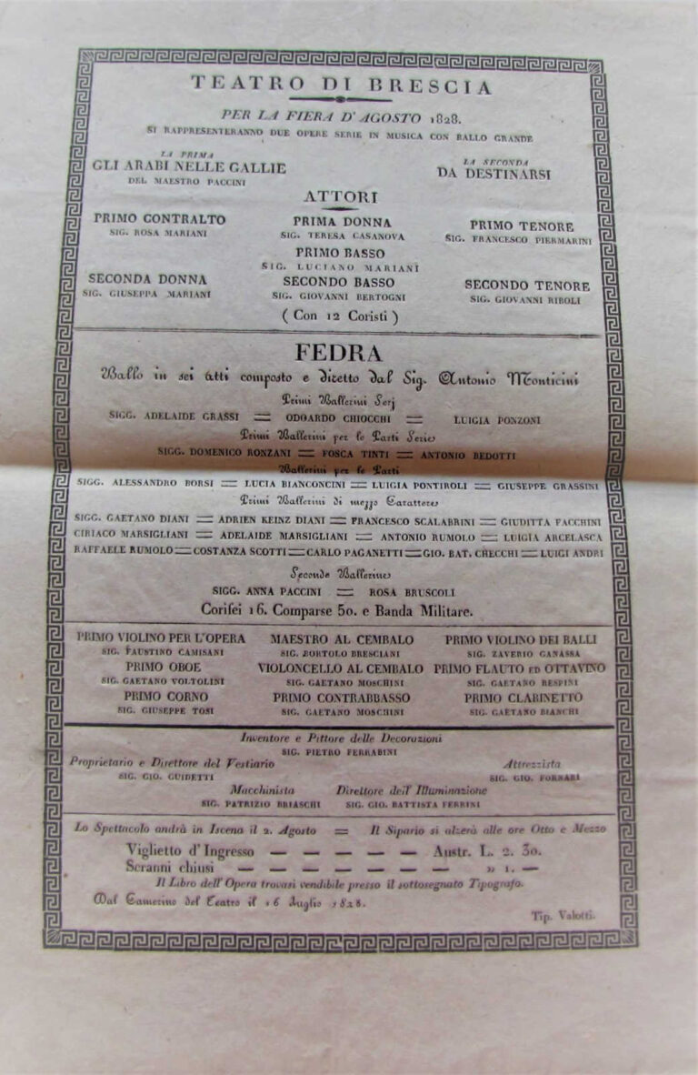 Se qualcuno volesse farsi un’idea dell’organizzazione del Teatro Grande di Brescia potrebbe recarsi all’Archivio di Stato cittadino per consultare le carte lì depositate che riguardano, appunto, il Teatro, istituzione che nacque come sede dell’Accademia degli Erranti riformandosi via via fino all’attuale struttura. Leggere i documenti illumina la mole, immensa, del lavoro che si svolge in un teatro d’opera. In ordine sparso: parrucchieri, architetti, cantanti, strumentisti, piastrellisti, sarti, fioristi, direttori d’orchestra, copisti, impresari, calzolai, muratori, falegnami, tipografi e così via. Ciascuna di queste “anime”, tutte affascinanti, invoglia a studi seri. Nel 1838, per la messa in scena del Roberto Devereux di Donizetti (rappresentata a Brescia solo pochi mesi dopo la sua prima al San Carlo di Napoli), servivano costumi e attrezzi descritti con grande precisione e scorrerne l’elenco rende evidenti la professionalità e la competenza che ancora animano il retro dei nostri teatri: si va da un “anello con grossa gemma per Roberto” alla “sciarpa azzura trapunta d’oro”, alle spade e agli scudi, fino a un “abito reale con manto” per Elisabetta, regina d’Inghilterra. La nostra “anima” è comunque quella musicale e questa vogliamo qui raccontare.