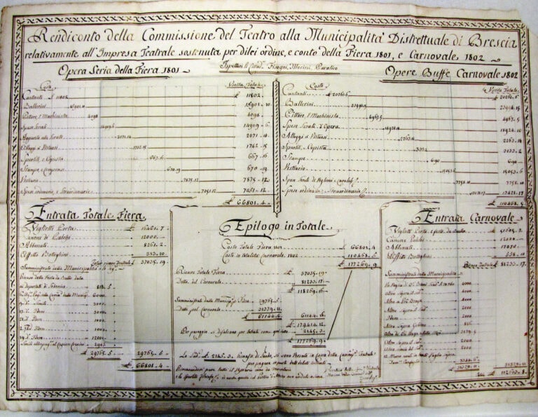 L’Ottocento rappresenta – per il Teatro Grande ma, in realtà, per tutte le istituzioni musicali cittadine – un periodo di grande agitazione. Durante la Repubblica Cisalpina il nuovo governo aveva imposto la chiusura degli Erranti e della sua Reggenza affidando l’organizzazione delle stagioni a un’apposita commissione formata da cinque “cittadini”. Questa commissione ha lasciato, perfettamente in ordine, i conti consuntivi del 1801-1802. Nel quaderno che accompagna il quadro generale troviamo le spese sostenute per le compagnie dei cantanti e dei ballerini, per gli spartiti e i copisti, per gli alloggi dei virtuosi, per il vestiario e così via. Nel 1811 Carlo Fisogni, allora fra i cittadini che formavano la commissione per il Teatro, aveva emanato un Istituto di beneficenza per li signori professori ed impiegati che lì operavano: si tratta di un lungimirante antecedente delle Società di Mutuo Soccorso che poco più tardi nacquero nel nostro paese.