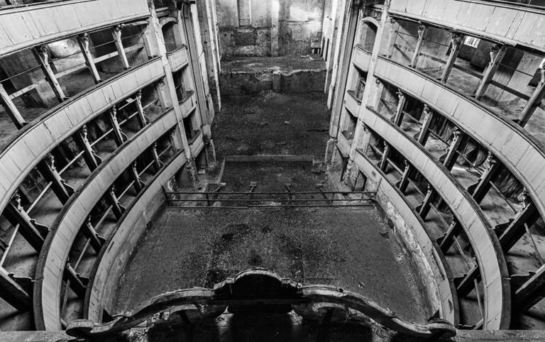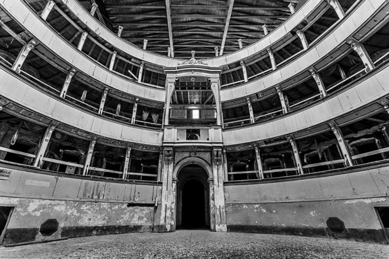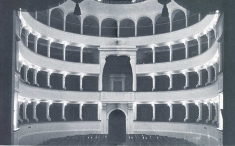 Nella sottostante Galleria fotografica si possono vedere l’interno originario del teatro in una stampa del 1873, l’allestimento liberty di Landi realizzato nel 1944, la ristrutturazione di Carlo Pisoni Ercoli del 1952 e lo stato di abbandono successivo agli anni ’60 del Novecento.